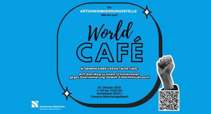 Wir laden alle Hochschulangehörigen, Mitarbeitende, Lehrende und Studierende, herzlich ein zum World-Café – dem Auftakt unseres partizipativen Schutzkonzeptprozesses an der Hochschule Niederrhein. In offener Atmosphäre möchten wir mit Ihnen an Thementischen ins Gespräch kommen, zentrale Themen des Schutzkonzeptes diskutieren und gemeinsam Bedarfe, Herausforderungen und erste Lösungsansätze sammeln.